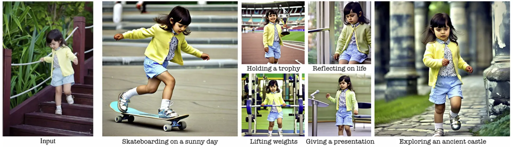 Dreambooth는 detail한 prompt없이 몇 장의 사진과 간단한 text만으로 consistent하면서 input subject의 identity를 보존하여 다양한 이미지 생성 가능함.