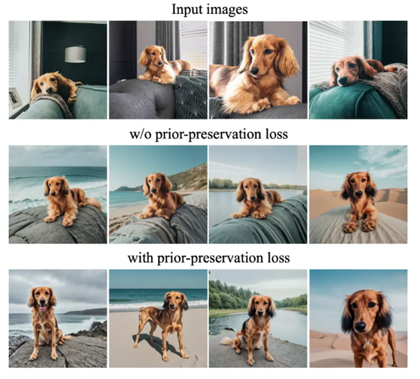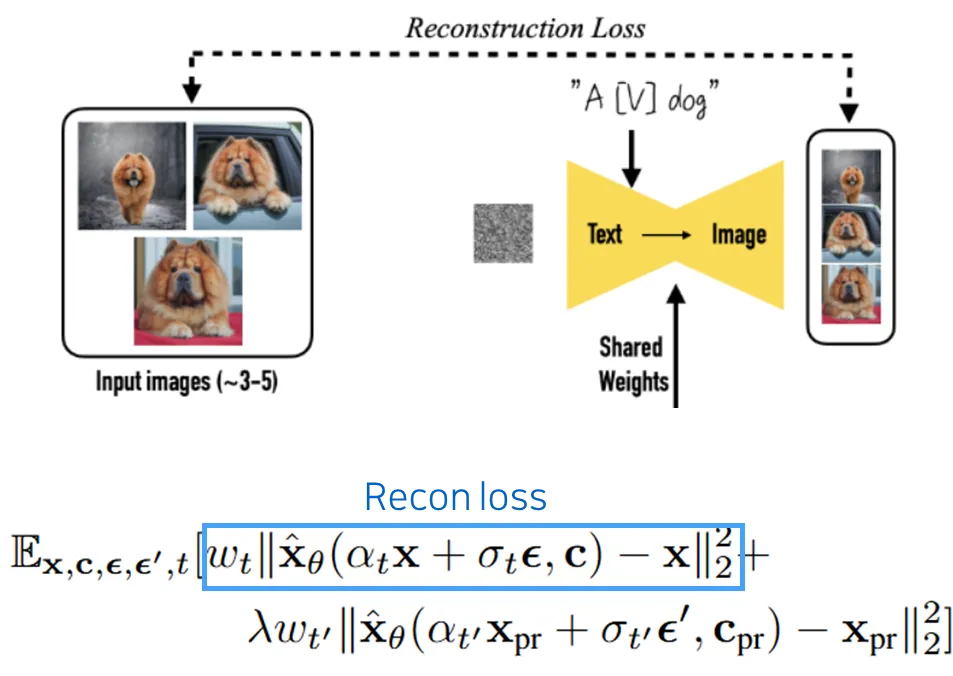 Reconstruction Loss만 사용할 경우, 모델이 “dog”라는 일반 개념을 잃어버리고 input된 특정 “sks dog"에만 overfitting되는 문제가 발생할 수 있음.