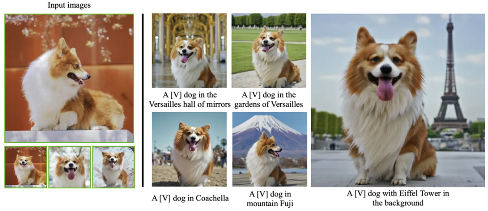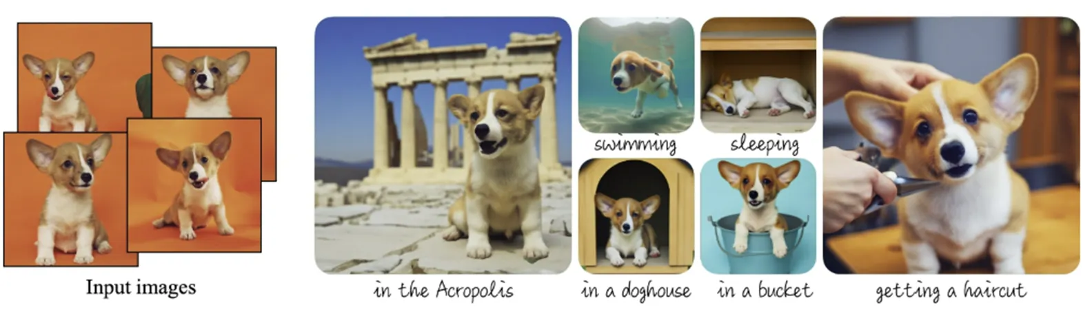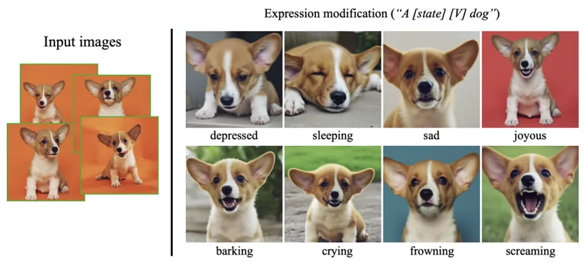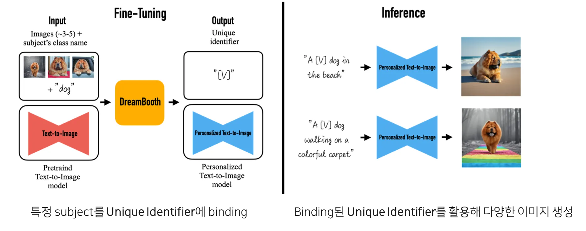 Fine-tuning 시, 학습시키고 싶은 subject의 이미지 5장 내외 + “A [Unique identifier] [Class noun]" (ex. “A sks dog") 형태로 텍스트를 넣어줌.