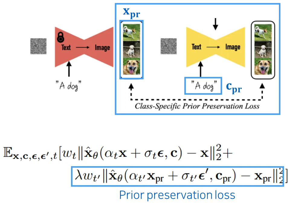 이를 방지하기 위해, 모델이 자체적으로 생성한 ”class 이미지”(ex. “A dog”을 input으로 줬을 때 생성되는 이미지)를 reconstruction하는 추가적인 손실을 줌 (Prior Preservation).