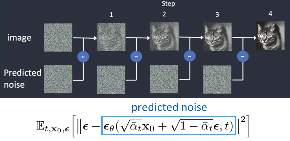 학습 시에는 각 단계별로 ‘이미지에 더해진 노이즈’를 예측하도록 UNet 등과 같은 모델을 훈련하며, L2 노이즈 예측을 위한 손실 함수를 사용.