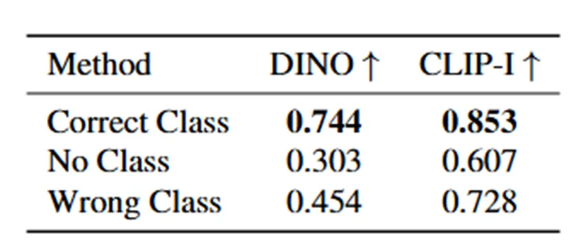 Subject에 대한 정확한 Class noun을 prompt에 넣어 같이 학습할 때 Subject Fidelity가 가장 높음.